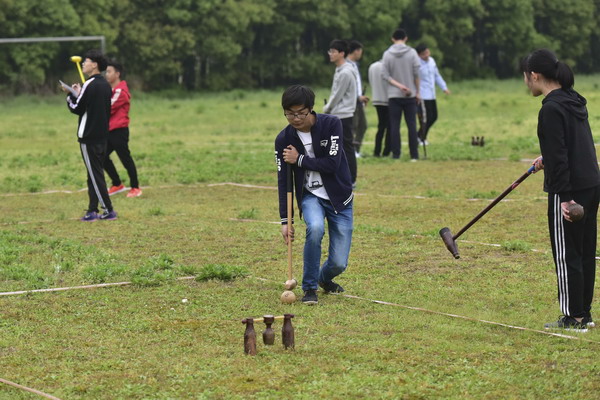 昨天下午,嘉興職業(yè)技術學院校園里,同學們揮舞球桿開展木球運動。