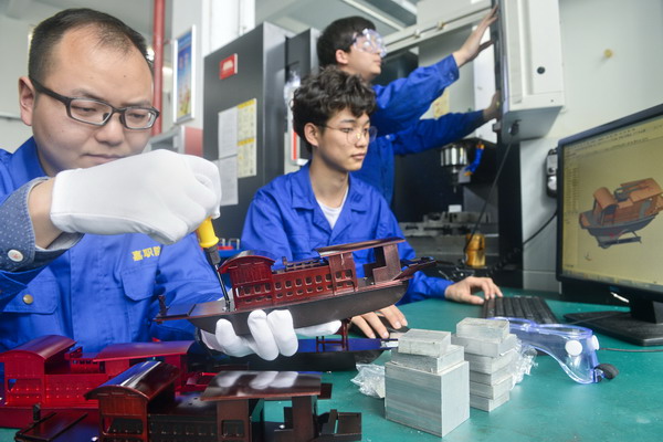日前,嘉興職業(yè)技術(shù)學(xué)院的師生根據(jù)南湖紅船尺寸制作三維模型,利用數(shù)控技術(shù)將鋁合金毛坯料“雕琢”成船身零部件,經(jīng)表面加工后最終完成紅船模型作品。圖為師生共同制作鋁合金紅船模型。(本報(bào)通訊員    王振宇  攝)