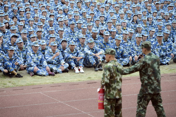 昨天,嘉興職業(yè)技術(shù)學(xué)院操場(chǎng)上,正在軍訓(xùn)的大一新生接受消防知識(shí)培訓(xùn),學(xué)習(xí)使用滅火器。