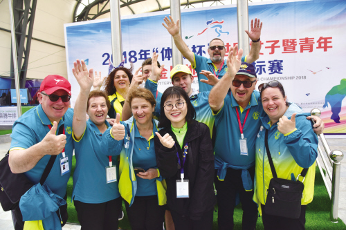 澳大利亞代表團的隊員們和隨隊志愿者——嘉職院的邵超穎同學歡樂合影。