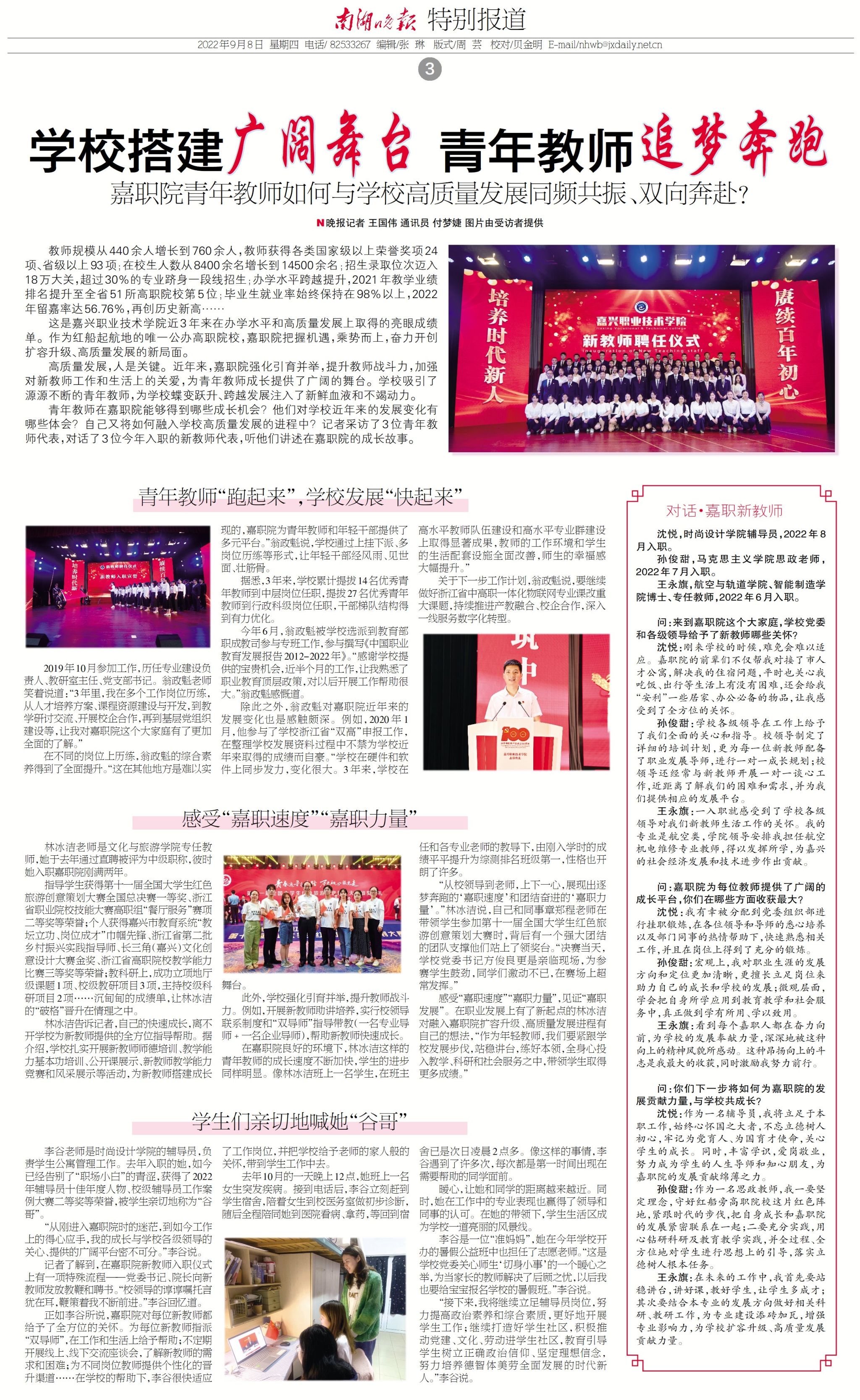 青年教師在嘉職院能夠得到哪些成長機(jī)會(huì)?他們對學(xué)校近年來的發(fā)展變化有哪些體會(huì)?自己又將如何融入學(xué)校高質(zhì)量發(fā)展的進(jìn)程中?記者采訪了3位青年教師代表,對話了3位今年入職的新教師代表,聽他們講述在嘉職院的成長故事。