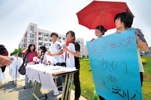昨天中午,嘉興職業(yè)技術(shù)學(xué)院紡工分院服裝系的同學(xué)在學(xué)校廣場舉辦了手繪T恤義賣活動,同學(xué)們義賣精心繪制的愛心T恤籌集款項,為災(zāi)區(qū)獻(xiàn)上一分愛心。