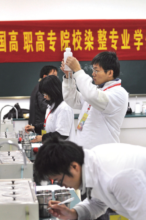 本報訊 昨天,第二屆全國高職高專院校染整專業(yè)學(xué)生技能大賽在嘉興職業(yè)技術(shù)學(xué)院舉行。此次大賽由教育部高職高專輕化類專業(yè)教學(xué)指導(dǎo)委員會主辦,嘉興職業(yè)技術(shù)學(xué)院承辦,來自浙江、江蘇、山東、湖北、廣東、四川等8個省份的19所高職高專院校的近百名學(xué)生參加了比賽。