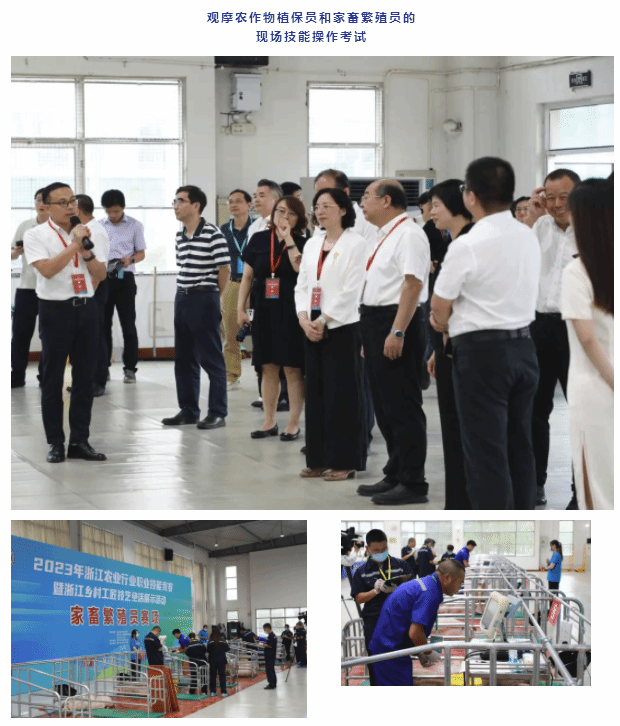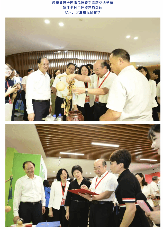 開幕式后,與會(huì)領(lǐng)導(dǎo)觀看首屆全國農(nóng)民技能競賽獲獎(jiǎng)選手和浙江鄉(xiāng)村工匠技藝絕活的展示、展演和現(xiàn)場教學(xué),觀摩農(nóng)作物植保員和家畜繁殖員的現(xiàn)場技能操作考試,與參賽選手、鄉(xiāng)村工匠等親切交流。