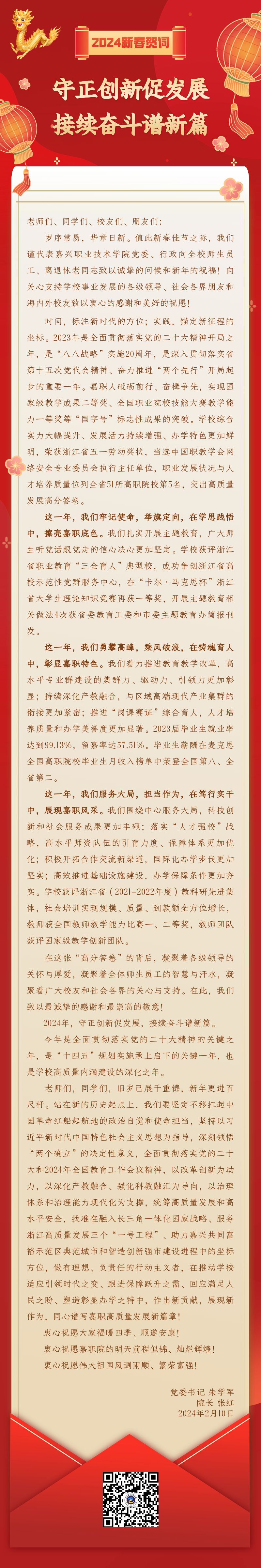 守正創(chuàng)新促發(fā)展,接續(xù)奮斗譜新篇——嘉職院甲辰龍年新春賀詞