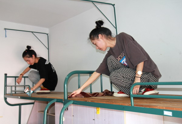 前來報(bào)到的姐姐周一平(左二)和妹妹周一凡(左三)是一對(duì)可愛的雙胞胎,她們之前都就讀于嘉善職業(yè)高中工藝美術(shù)專業(yè),姐妹倆同時(shí)考入紡織與藝術(shù)設(shè)計(jì)學(xué)院工業(yè)設(shè)計(jì)181班。2000年出生的姐妹倆酷愛藝術(shù),動(dòng)手能力強(qiáng),一進(jìn)寢室就打掃衛(wèi)生,設(shè)計(jì)窗簾,為自己和同學(xué)營造文明溫馨的學(xué)習(xí)生活環(huán)境。