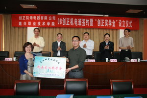 5月11日下午,嘉興職業(yè)技術(shù)學(xué)院與創(chuàng)正防爆電器有限公司合作組建的“08創(chuàng)正機(jī)電班”簽約暨“創(chuàng)正愛(ài)心獎(jiǎng)學(xué)金”設(shè)立儀式在學(xué)院行政樓1號(hào)樓506會(huì)議室隆重舉行。創(chuàng)正防爆電器有限公司副總經(jīng)理魏壇霖,公司人事處經(jīng)理張譯文,生產(chǎn)部經(jīng)理葉勤豐,學(xué)院副院長(zhǎng)周建新,學(xué)院學(xué)生處及科技與產(chǎn)學(xué)合作處領(lǐng)導(dǎo)及相關(guān)教師,機(jī)電分院領(lǐng)導(dǎo),“08創(chuàng)正機(jī)電班”班主任與相關(guān)老師,“08創(chuàng)正機(jī)電班”全體學(xué)生共同參會(huì)。會(huì)議由機(jī)電分院黨總支書(shū)記童云飛主持。
