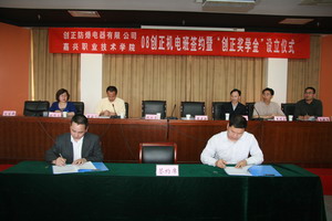 會(huì)上,學(xué)院副院長(zhǎng)周建新與公司副總經(jīng)理魏壇霖簽署了“08創(chuàng)正機(jī)電班”訂單培養(yǎng)協(xié)議;公司、機(jī)電分院、學(xué)生代表共同簽署“08創(chuàng)正機(jī)電班”定向?qū)嵙?xí)就業(yè)三方協(xié)議。公司與學(xué)院領(lǐng)導(dǎo)共同為“創(chuàng)正愛(ài)心獎(jiǎng)學(xué)金”的設(shè)立隆重揭牌。