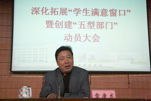 章康龍首先從深入學(xué)習(xí)實(shí)踐科學(xué)發(fā)展觀,建立、延展學(xué)習(xí)長效機(jī)制這個角度高屋建瓴地指出拓展“學(xué)生滿意窗口”、創(chuàng)建學(xué)院“五型部門”(學(xué)習(xí)型、創(chuàng)新型、服務(wù)型、效能型、廉潔型)的重要意義。他總結(jié)了活動開展以來所取得的成績:“學(xué)生滿意窗口”創(chuàng)建成效明顯;學(xué)習(xí)措施扎實(shí),各滿意窗口結(jié)合服務(wù)對象內(nèi)容、特點(diǎn)推出服務(wù)學(xué)生的舉措,如圖書館閱覽室的文明雨傘、愛心雨具盒等獲得學(xué)生的一致好評;師生關(guān)系進(jìn)一步融洽,學(xué)生是服務(wù)主體的理念和觀念進(jìn)一步增強(qiáng)。同時,他指出存在的問題:活動開展的覆蓋面還有待進(jìn)一步擴(kuò)大;極少數(shù)工作人員重視不夠,沒有推出行之有效的具體措施等。