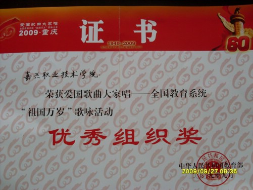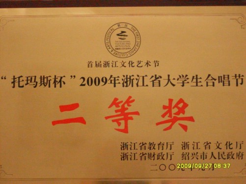 10月22日,由國家教育部主辦的慶國慶60周年“祖國萬歲”歌詠系列活動之2009浙江省大學(xué)生合唱節(jié)在紹興大劇院勝利閉幕。我院紅菱女子合唱團載譽而歸,獲得了“托瑪斯杯”2009年浙江省大學(xué)生合唱節(jié)決賽銀獎,同時還被授予省級優(yōu)秀組織獎。更為可喜的是,通過學(xué)院各項文化建設(shè)工作的開展,我院還被國家教育部評為國家級優(yōu)秀組織獎單位。