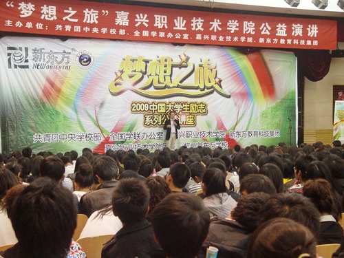 為激發(fā)我院廣大同學(xué)學(xué)習(xí)英語(yǔ)的熱情,掌握學(xué)習(xí)英語(yǔ)的科學(xué)方法,提高英語(yǔ)的技能與水平,提升大學(xué)生綜合素質(zhì),促進(jìn)大學(xué)生全面成長(zhǎng)成才,4月7日晚6點(diǎn),由共青團(tuán)中央學(xué)校部、全國(guó)學(xué)聯(lián)辦公室、嘉興職業(yè)技術(shù)學(xué)院團(tuán)委和新東方教育科技集團(tuán)聯(lián)合舉辦的“夢(mèng)想之旅 2009”中國(guó)大學(xué)生勵(lì)志系列公益講座在我院報(bào)告廳隆重舉行,來(lái)自全院1400余名大學(xué)生到場(chǎng)認(rèn)真聆聽(tīng)了本次講座。