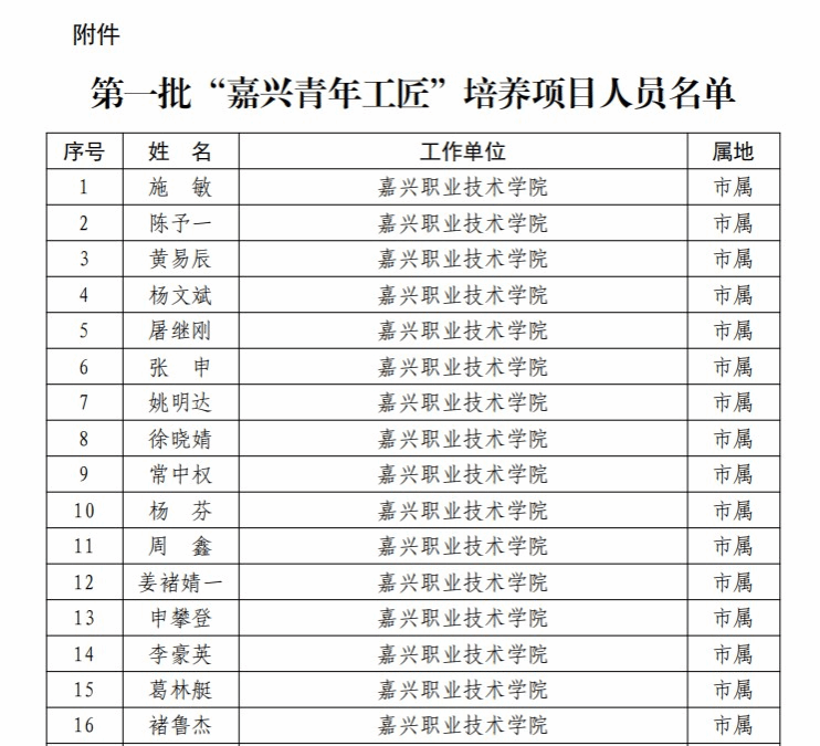 近日,嘉興市人力資源和社會保障局、嘉興市教育局、共青團(tuán)嘉興市委員會公布了第一批“嘉興青年工匠”培養(yǎng)項(xiàng)目人員名單,嘉職院16位青年師生榜上有名。
