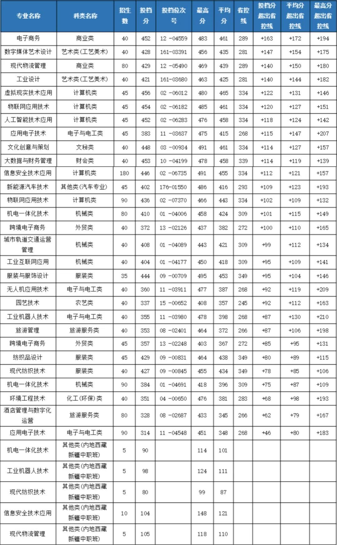 可喜的是,隨著學(xué)校近幾年的快速發(fā)展,社會(huì)影響力和美譽(yù)度不斷提升,所有招生專業(yè)投檔分、平均分、最高分在去年基礎(chǔ)上又有大幅提升。15個(gè)專業(yè)的投檔分?jǐn)?shù)線超省控線100分以上,其中電子商務(wù)專業(yè)超163分;22個(gè)專業(yè)的錄取平均分超省控線100分以上,其中電子商務(wù)專業(yè)超172分。所有專業(yè)的錄取最高分全部超省控線100分以上,其中工業(yè)機(jī)器人技術(shù)專業(yè)超過(guò)210分。
