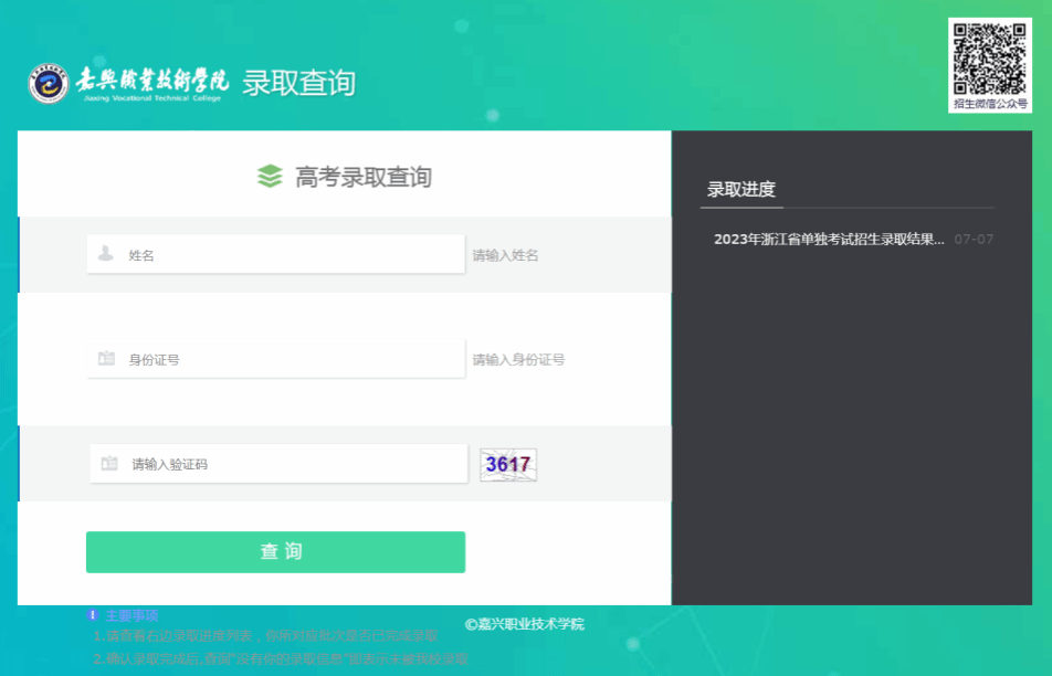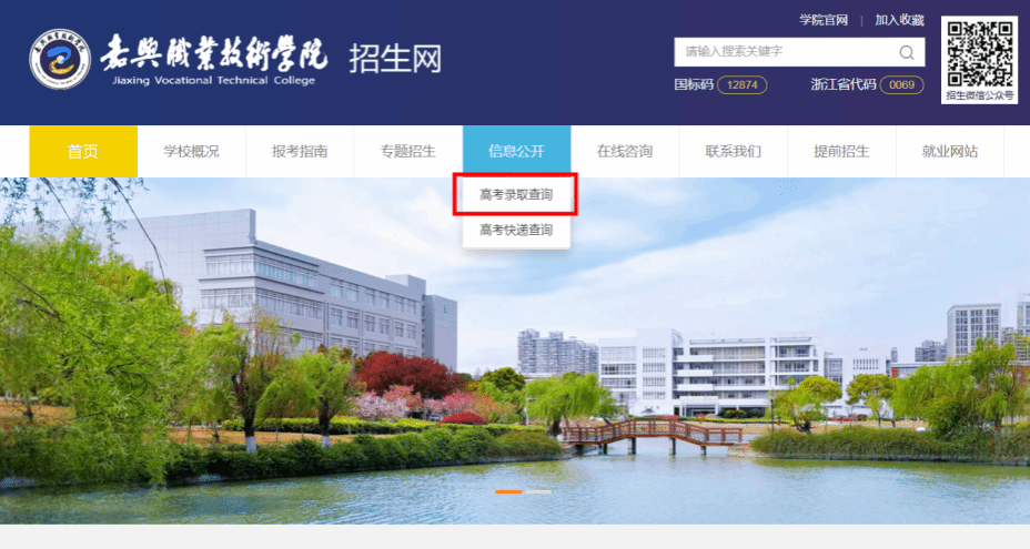 考生可登錄嘉職院招生網(wǎng)(https://zjw.jxvtc.edu.cn/)點(diǎn)擊首頁(yè)標(biāo)題欄“信息公開(kāi)”中的“高考錄取查詢”,進(jìn)入查詢頁(yè)面后,輸入個(gè)人信息,點(diǎn)擊“查詢”即可查詢錄取結(jié)果。