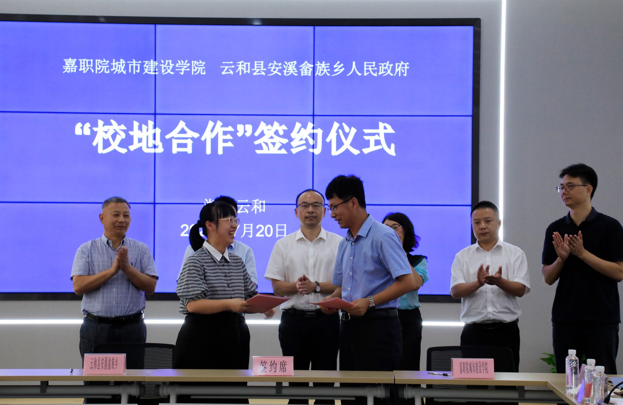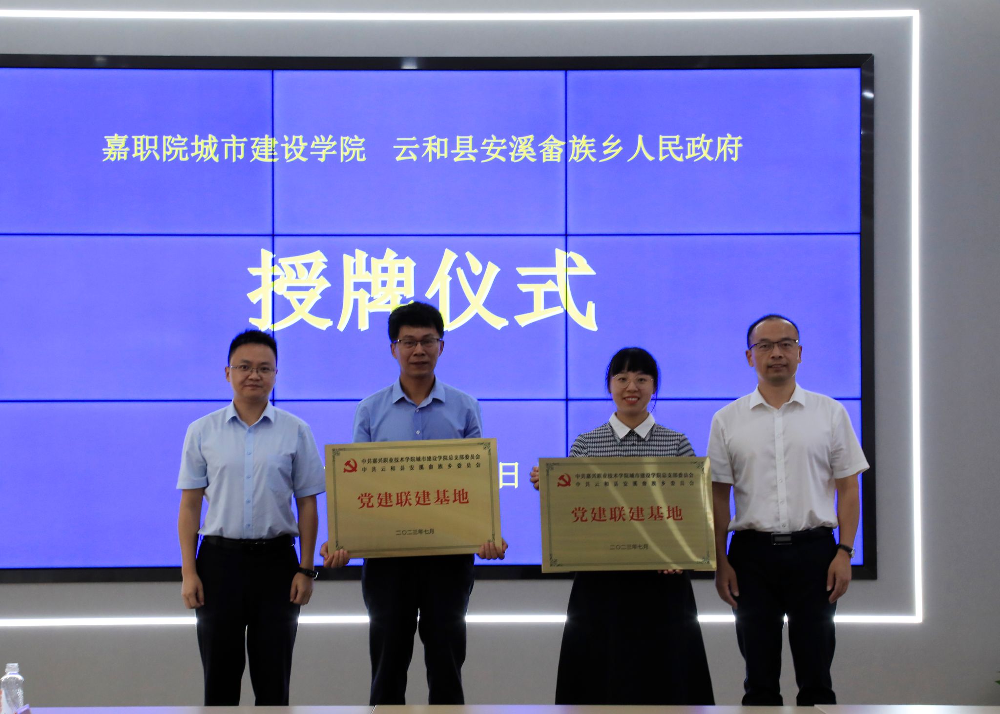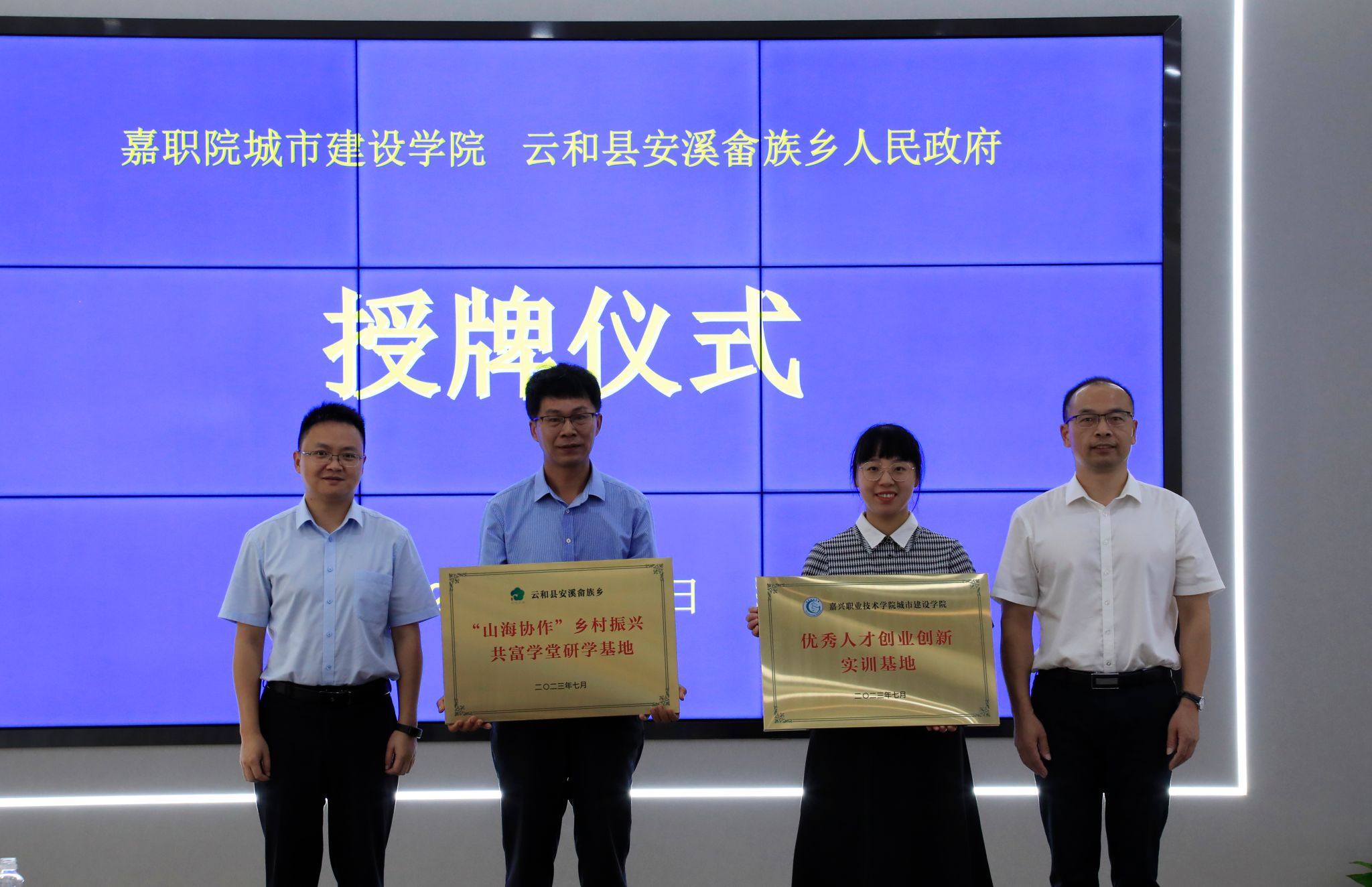 會議現(xiàn)場,嘉職院與云和縣人民政府簽署戰(zhàn)略合作框架協(xié)議,嘉職院城市建設學院與云和縣安溪畬族鄉(xiāng)簽署“共敘山海情 攜手共富路”校地合作協(xié)議。中共嘉興職業(yè)技術學院城市建設學院總支部委員會與云和縣安溪畬族鄉(xiāng)委員會互授“黨建聯(lián)建基地”牌匾。城市建設學院向溪畬族鄉(xiāng)人民政府授牌“優(yōu)秀人才創(chuàng)業(yè)創(chuàng)新實訓基地”;安溪畬族鄉(xiāng)人民政府向城市建設學院授牌“‘山海協(xié)作’鄉(xiāng)村振興共富學堂研學基地”。