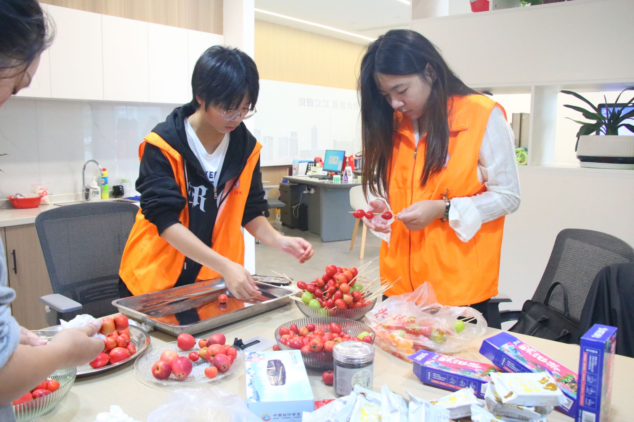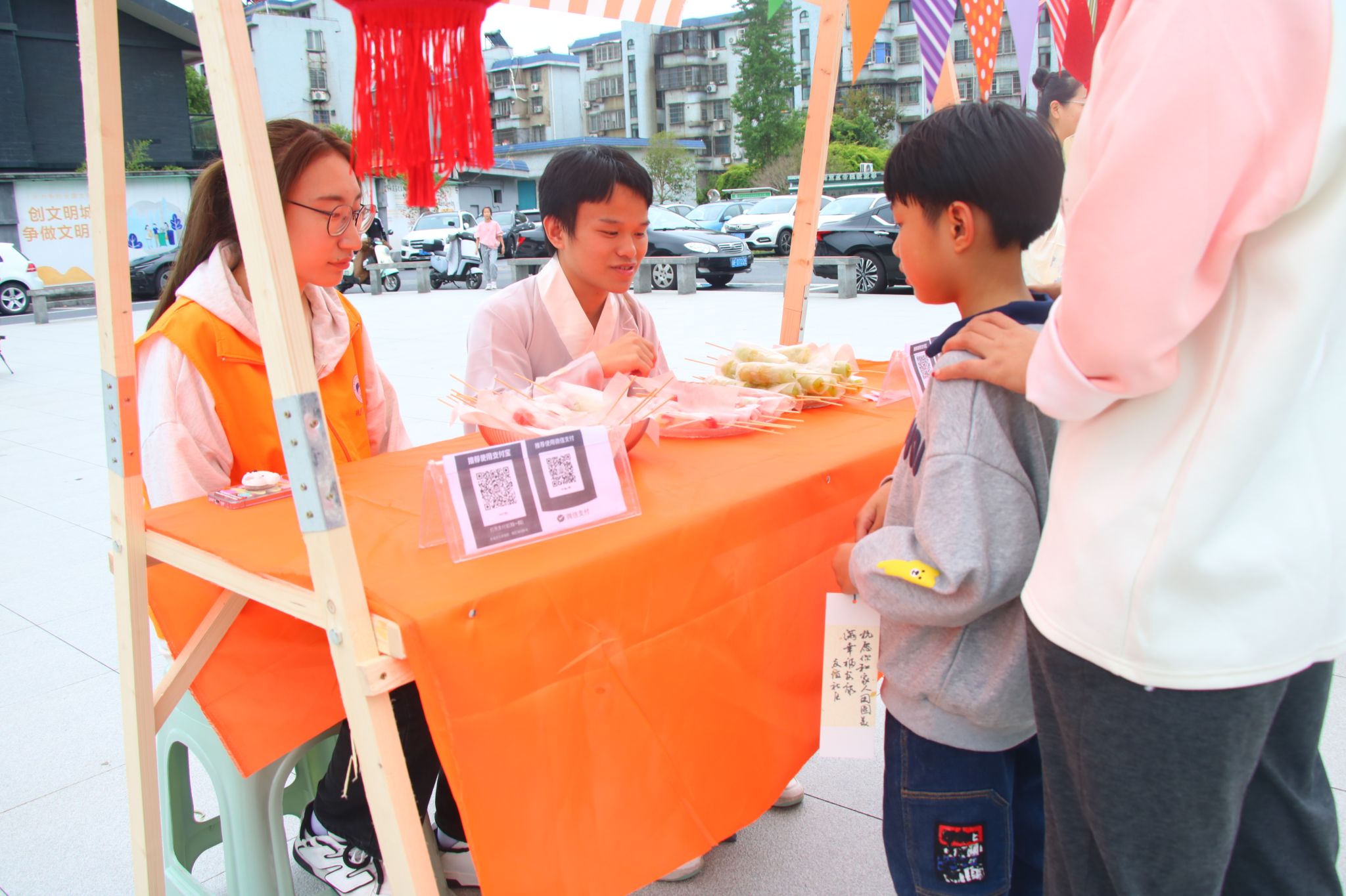 舞臺(tái)下,學(xué)生志愿者和社區(qū)青年們一起動(dòng)手制作糖葫蘆、拉彩旗,并身著漢服與現(xiàn)場(chǎng)觀眾互動(dòng),節(jié)日氛圍顯得格外濃厚。