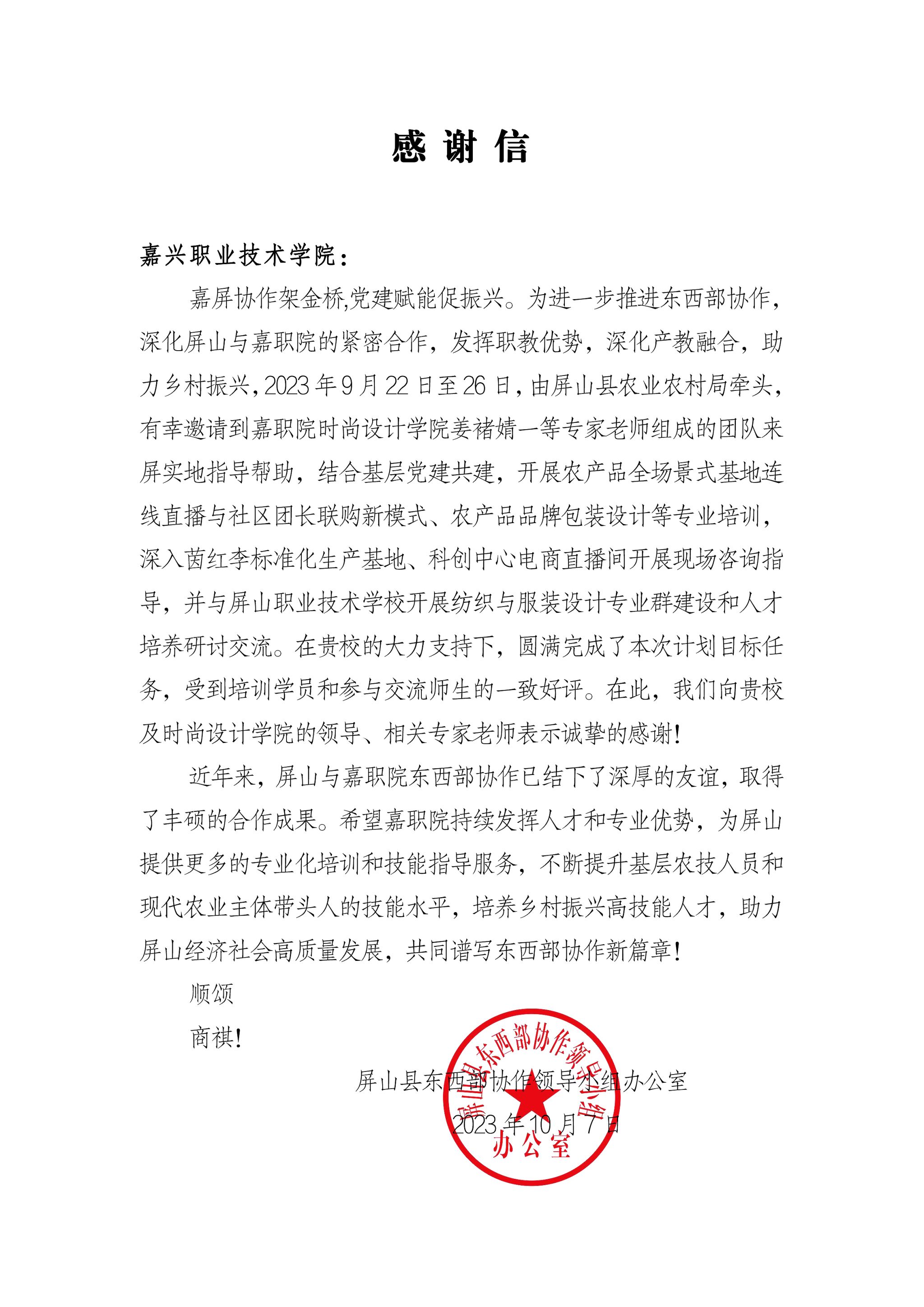10月8日,嘉職院收到來自四川屏山縣東西部協(xié)作領導小組辦公室發(fā)來的感謝信,感謝學校時尚設計學院教師姜褚婧一等組成團隊來屏提供專業(yè)化培訓和技能指導服務。