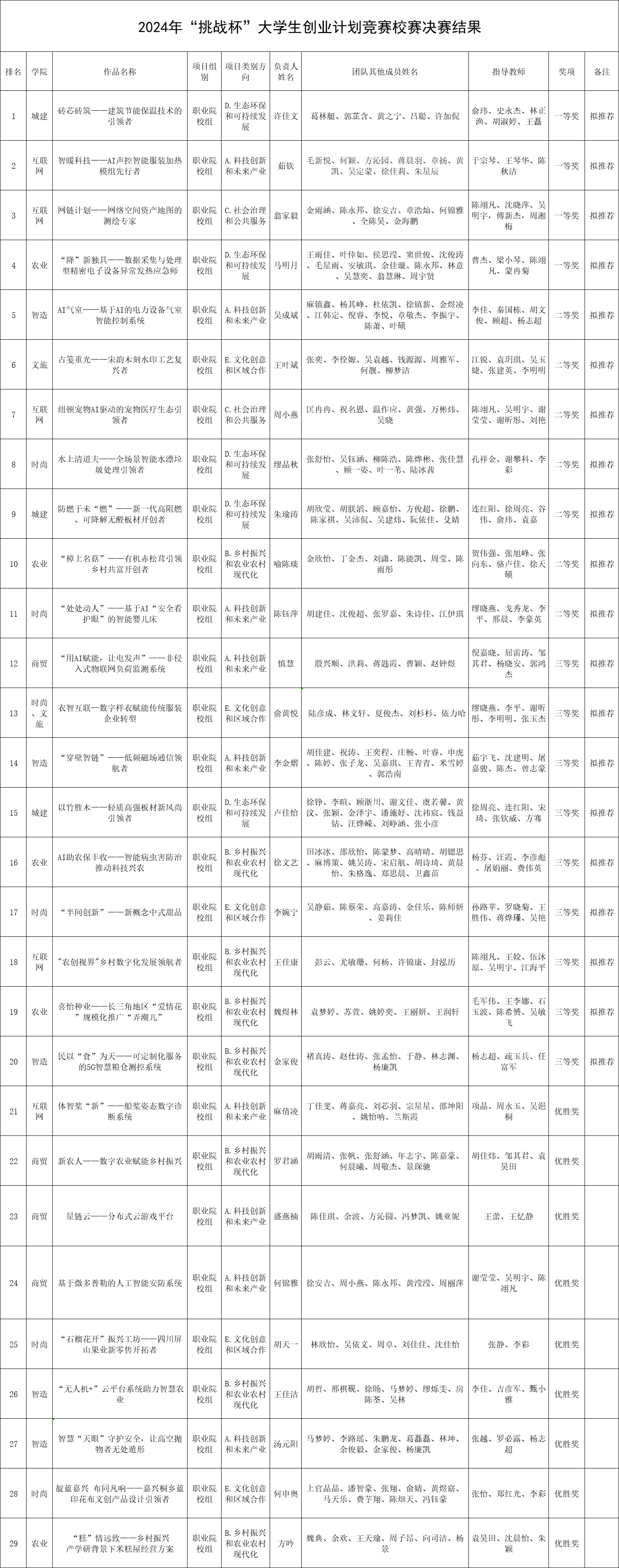 根據(jù)《關(guān)于舉辦2024年“挑戰(zhàn)杯”大學(xué)生創(chuàng)業(yè)計(jì)劃競賽校賽的通知》,經(jīng)校賽組織專家評審,共評選出一等獎4項(xiàng),二等獎7項(xiàng),三等獎9項(xiàng),優(yōu)勝獎9項(xiàng),現(xiàn)予以公示。公示期為2024年4月11日——2024年4月17日,如有疑問或異議,請及時(shí)與校團(tuán)委聯(lián)系,聯(lián)系電話:0573-89978126。