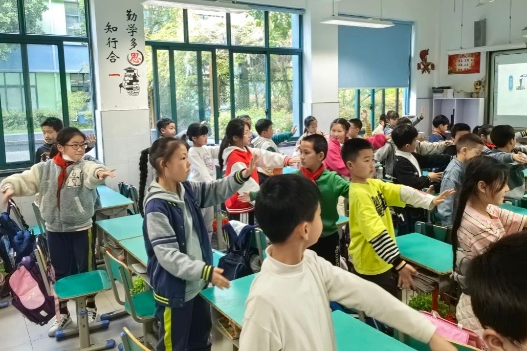 “聽口令做動作”游戲環(huán)節(jié),教師隨機說一個地鐵中的手勢信號,孩子們爭先恐后舉手上臺,舉著信號旗比劃,積極模仿地鐵中的通過、停車、減速以及發(fā)車、連掛、溜放等信號,現(xiàn)場一片歡聲笑語,將活動推至高潮。