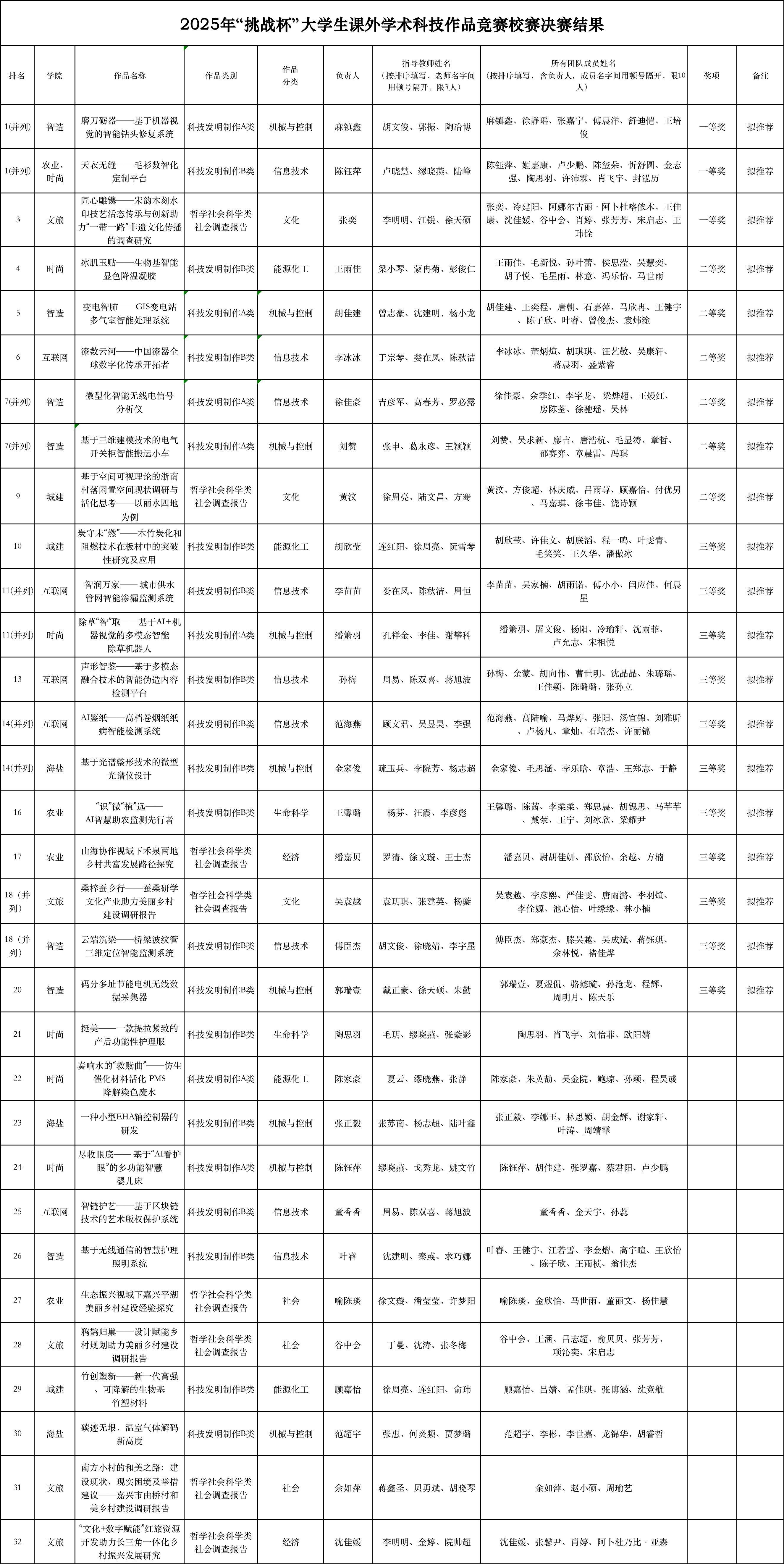 根據(jù)《關(guān)于組織開展2025年“挑戰(zhàn)杯”大學(xué)生課外學(xué)術(shù)科技作品競賽校賽的預(yù)通知》,經(jīng)專家評審,共評選出一等獎3項(xiàng),二等獎6項(xiàng),三等獎11項(xiàng),現(xiàn)予以公示。公示期為2025年4月7日——2025年4月11日,如有疑問或異議,請及時(shí)與校團(tuán)委聯(lián)系,聯(lián)系電話:0573-89978126。