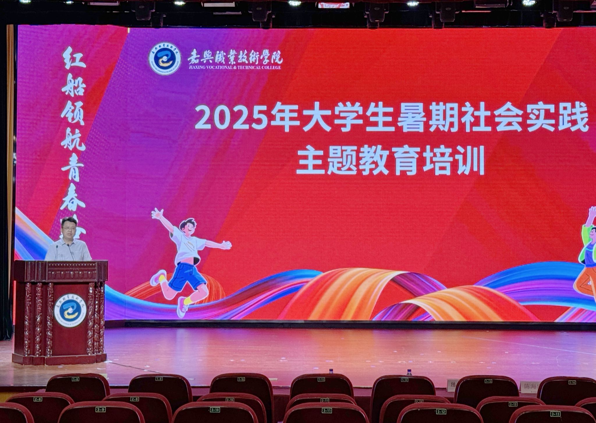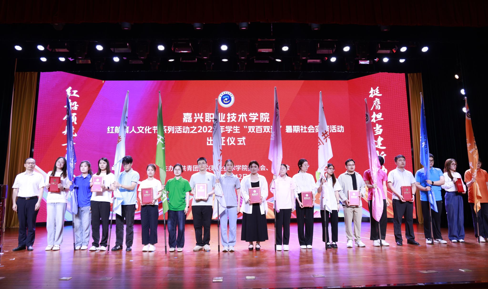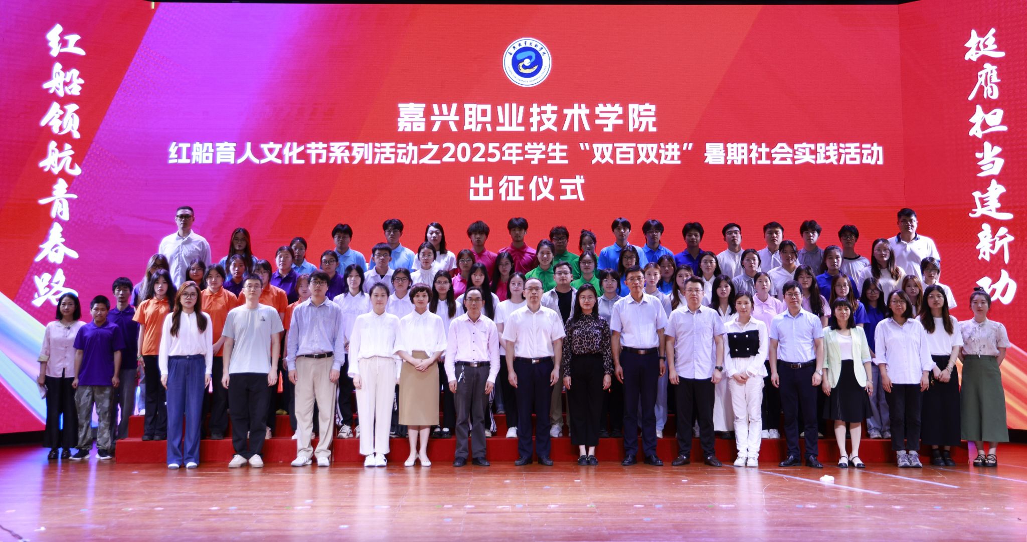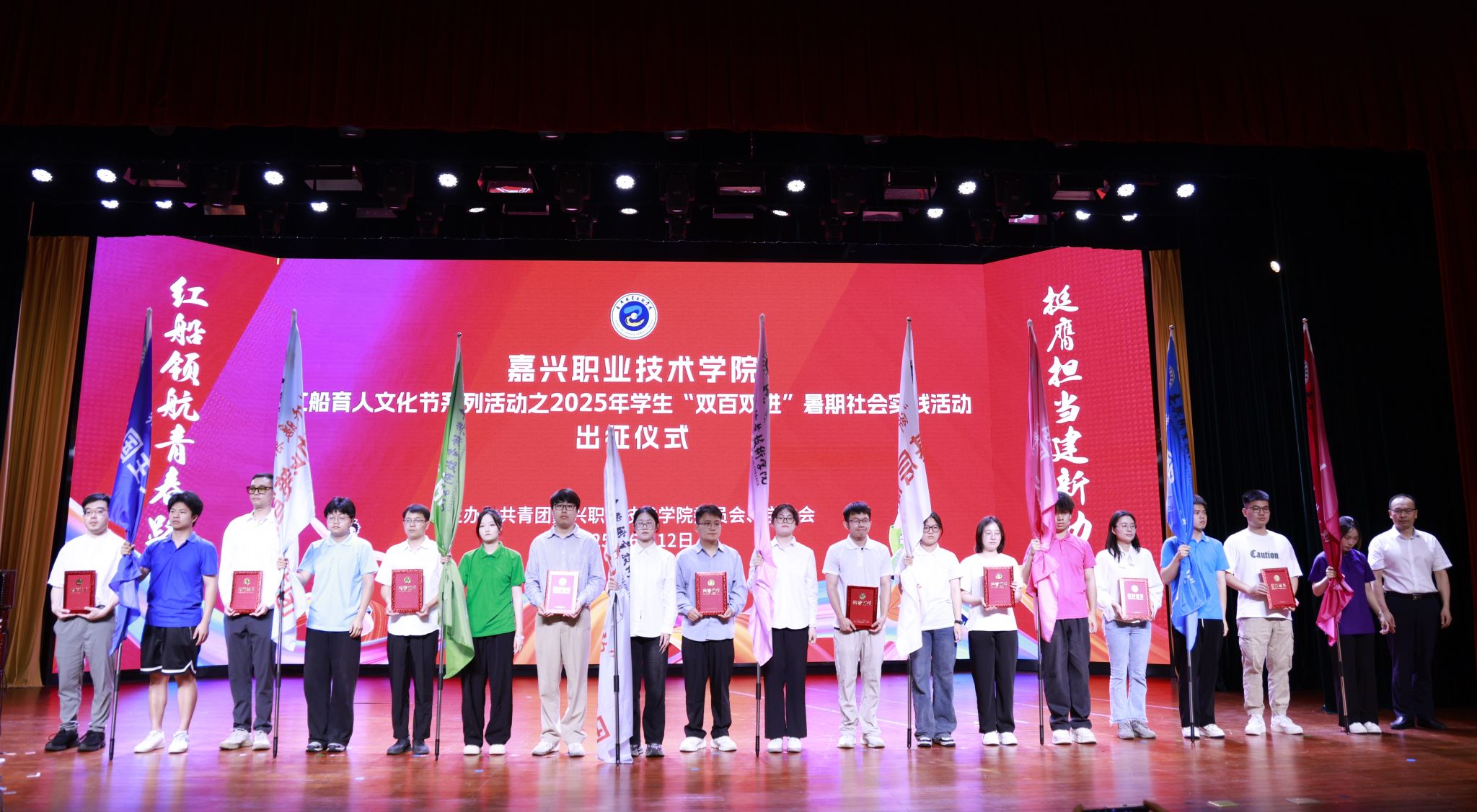 6月12日,嘉職院舉行2025年大學生“雙百雙進”暑期社會實踐活動出征儀式,為即將奔赴四面八方、投入火熱實踐的青春力量壯行。黨委委員、副校長陳海忠出席會議,講話,并為出征團隊授旗。