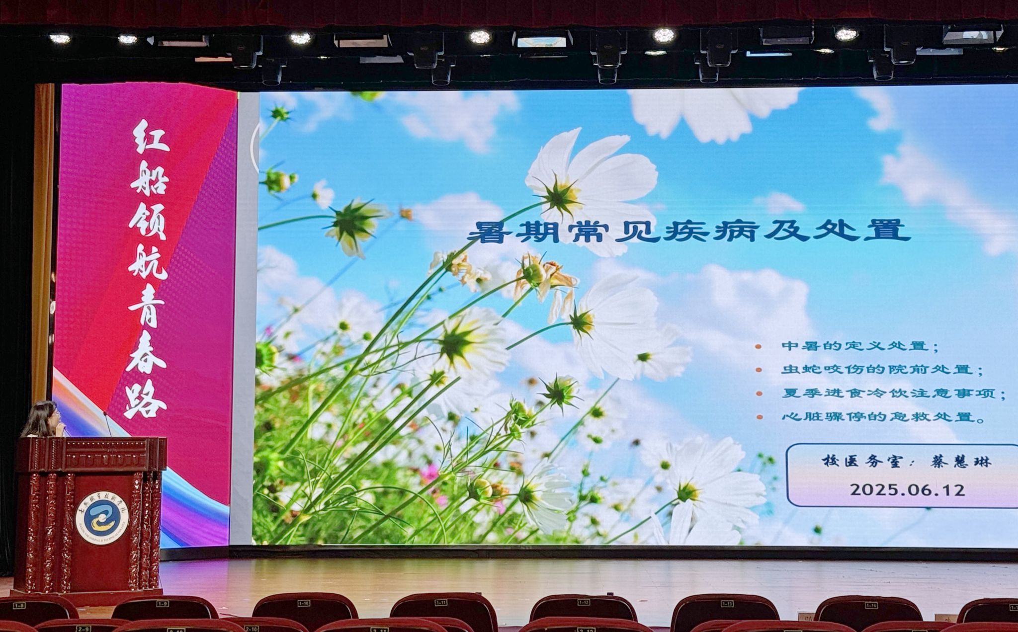 出征儀式后,學校保衛(wèi)部、醫(yī)務(wù)室為全體參加實踐學生做安全、醫(yī)護知識培訓。