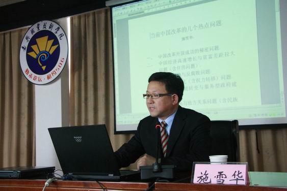 論壇別開(kāi)生面地由與會(huì)人員選擇講座主題,然后由施雪華教授逐一展開(kāi)講授。施雪華分別就大家所關(guān)心的幾個(gè)熱點(diǎn)問(wèn)題進(jìn)行了詳盡的闡述:中國(guó)改革開(kāi)放成功的秘密;中國(guó)經(jīng)濟(jì)高速增長(zhǎng)與貧富差距拉大問(wèn)題(含住房問(wèn)題);中國(guó)當(dāng)前腐敗與反腐敗問(wèn)題;中國(guó)的教育與就業(yè)問(wèn)題。施教授認(rèn)為關(guān)于中國(guó)改革開(kāi)放成功的秘密,農(nóng)村生產(chǎn)承包責(zé)任制是秘密之一。另外也有學(xué)者認(rèn)為外資的積累促成中國(guó)社會(huì)由傳統(tǒng)農(nóng)業(yè)型向現(xiàn)代化邁進(jìn)。施教授談及中國(guó)經(jīng)濟(jì)快速穩(wěn)定發(fā)展時(shí)認(rèn)為,這與國(guó)家控股的大中型企業(yè)息息相關(guān),國(guó)有企業(yè)轉(zhuǎn)制與中小型企業(yè)效益問(wèn)題影響著國(guó)家經(jīng)濟(jì)發(fā)展。國(guó)際金融風(fēng)暴導(dǎo)致國(guó)內(nèi)房地產(chǎn)業(yè)壓力升高。施教授列舉了一些國(guó)內(nèi)外案例,將中國(guó)當(dāng)前的腐敗與反腐敗問(wèn)題與當(dāng)下國(guó)際情況進(jìn)行了比對(duì)。他重點(diǎn)介紹了與學(xué)院發(fā)展密切相關(guān)的高等教育的一些問(wèn)題,介紹了當(dāng)前產(chǎn)業(yè)結(jié)構(gòu)鏈變化引發(fā)高校教育與就業(yè)的相關(guān)問(wèn)題,產(chǎn)業(yè)結(jié)構(gòu)的調(diào)整導(dǎo)致市場(chǎng)需求變動(dòng),對(duì)高校教育的服務(wù)性提出了更高的要求。