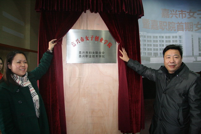 學院黨委委員、紀委書記章康龍與市婦聯(lián)副主席許紅蓮為嘉興市女子創(chuàng)業(yè)學院揭牌