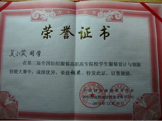 本次大賽共有來自全國26所高職高專院校的78位選手參加服裝設(shè)計與制版的比賽,經(jīng)過激烈的角逐,由陳泓、趙綺、羅曉菊三位老師指導(dǎo)的張宇婷、吳小笑、陳映雪三位同學(xué)分別榮獲銀獎、銅獎與優(yōu)秀獎。此外,我院還獲得了“團體組織優(yōu)勝獎”獎項,為學(xué)校爭得了榮譽。(趙琦)
