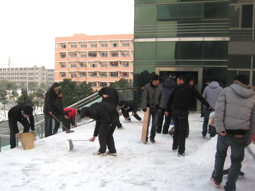 自12月15日起,今冬的第一場雪下得紛紛揚揚,將嘉職院妝點得銀裝素裹,分外妖嬈。在帶來喜氣與歡樂的同時,大雪天氣也給校內(nèi)交通帶來了諸多不便。16日早上6:50,機電分院黨總支組織學(xué)生黨員40余人,連同學(xué)院后勤設(shè)備處人員及道路保潔員工一起,趕在老師和同學(xué)上課之前,不畏寒冷,義務(wù)掃雪,為師生的通行提供了安全保障。學(xué)院后勤設(shè)備處工作人員還對通向食堂的拱橋上的積雪進行鏟除,并在東西主干道上灑了100多斤鹽。