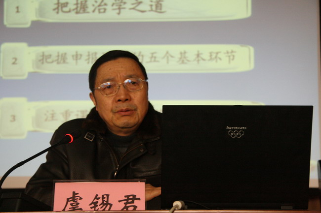 虞處長提出教師要把握好“厚積薄發(fā)、頂天立地、和而不同”的治學之道。隨后,虞處長以自己的科研工作經(jīng)歷為例,向我院青年教師詳細講解了申報課題需要把握的五個基本環(huán)節(jié):選擇和凝煉一個好題目、認真設(shè)計好研究內(nèi)容、注重填寫好研究方法和研究路線、實事求是地填好研究基礎(chǔ)、注重邏輯歸納和文字錘煉。最后,他從研究各類獎項的規(guī)則、重點及運作機制等方面講解了如何將課題成果轉(zhuǎn)化為獲獎成果。