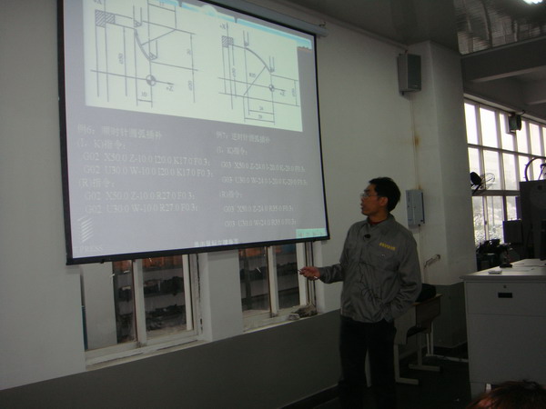 王道宏教授邊現(xiàn)場操作邊為大家作了一堂《螺紋軸類零件的編程與加工》的公開課。他從復習簡單軸類零件的編程與加工入手,引入到新學知識螺紋軸類零件的編程與加工,通過案例分析和項目訓練,指導大家學習數(shù)控車的工藝分析方法。