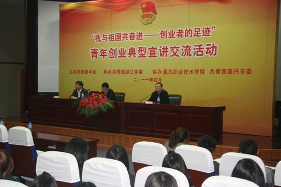 4月14日,由共青團(tuán)中央主辦、共青團(tuán)浙江省委協(xié)辦、嘉興職業(yè)技術(shù)學(xué)院和嘉興團(tuán)市委承辦的“我與祖國(guó)共奮進(jìn)——創(chuàng)業(yè)者的足跡”青年創(chuàng)業(yè)典型走進(jìn)高職院校首場(chǎng)報(bào)告會(huì)在我院舉行。第五屆中國(guó) 青年創(chuàng)業(yè)獎(jiǎng)獲得者、山東旗幟軟件股份有限公司董事長(zhǎng)韓烽,第六屆中國(guó)青年創(chuàng)業(yè)獎(jiǎng)獲得者、溫州市維日康生物科技有限公司董事長(zhǎng)王賢俊以及我院大學(xué)生代表等300余人參加了本次活動(dòng)。