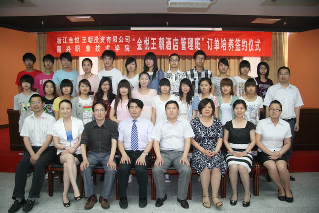 5月31日下午,我院與嘉興隆聚餐飲集團(tuán)(原為金悅王朝投資有限公司)簽訂了酒店管理班人才培養(yǎng)協(xié)議。學(xué)院黨委副書記、副院長周建新、嘉興隆聚餐飲集團(tuán)董事長盛富林、外語與貿(mào)易分院副院長王家慶、外語與貿(mào)易分院院長助理袁姝及訂單班同學(xué)出席了簽約儀式。