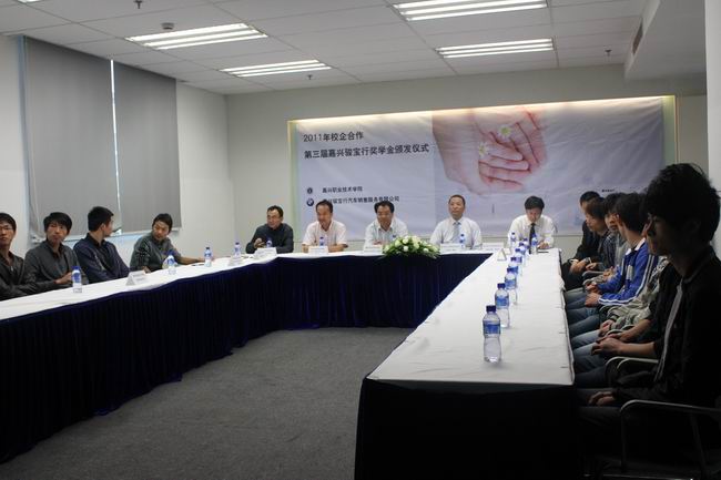 10月24日下午,2011年第三屆駿寶行獎(jiǎng)學(xué)金在嘉興駿寶行汽車銷售服務(wù)有限公司現(xiàn)場(chǎng)頒發(fā),機(jī)電與汽車分院2009、2010級(jí)5名品學(xué)兼優(yōu)學(xué)生受到表彰。他們不僅每人領(lǐng)到了600元獎(jiǎng)學(xué)金,而且“零距離”感受到了企業(yè)的職場(chǎng)文化與汽車行業(yè)的發(fā)展前景。