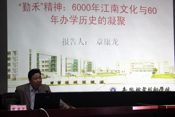 章康龍副院長(zhǎng)解讀了“勤澤禾魂”深刻內(nèi)涵,并就“勤澤禾魂”——江南文化教育傳承的人文特征、“勤澤禾魂”——嘉職院辦學(xué)六十年的生動(dòng)實(shí)踐、進(jìn)一步培育和弘揚(yáng)“勤禾”精神三個(gè)方面展開深入淺出的講述。他指出“勤澤禾魂”的文化精神是嘉職院60余年發(fā)展的重要?jiǎng)恿Γ趯W(xué)生層面來講即勤學(xué)勤練,茁壯成長(zhǎng);于教師層面即辛勤耕耘,真抓實(shí)干,弘揚(yáng)崇文厚德、求實(shí)創(chuàng)新的傳統(tǒng)。他強(qiáng)調(diào)嘉職院發(fā)展的歷史就是傳承和發(fā)揚(yáng)“勤禾”精神的歷史,勉勵(lì)嘉職院人應(yīng)從四個(gè)方面進(jìn)一步弘揚(yáng)“勤禾”精神:一要進(jìn)一步培育和弘揚(yáng)“愛崗敬業(yè)、腳踏實(shí)地”的職業(yè)精神;二要進(jìn)一步培育和弘揚(yáng)“艱苦奮斗、真抓實(shí)干”的創(chuàng)業(yè)精神;三要進(jìn)一步培育和弘揚(yáng)“銳意進(jìn)取、追求卓越”的創(chuàng)新精神;四要進(jìn)一步培育和弘揚(yáng)“知行合一、以德為先”的學(xué)習(xí)精神。