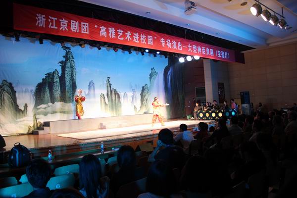2012年的“高雅藝術進校園”活動讓嘉職院學子走進國粹文化、感受京劇藝術。京劇是中國的國粹,已有兩百多年的歷史,享譽海內外,它最大限度超脫了舞臺空間和時間的限制,達到“以形傳神,形神兼?zhèn)洹钡乃囆g境界。在歷時100分鐘的演出過程中,京劇演員們的精彩表演讓同學們沉醉其中,婉轉迂回的唱腔、眼波流轉的明眸、眼花繚亂的武戲,讓在場師生看得目不轉睛,有時候一幕落下才回過神來,緊接著就是陣陣熱烈的掌聲與喝彩。演員們謝幕之后,同學們還在討論劇中沉香救母的感人情節(jié),回味著優(yōu)秀青年演員們的傳神表演。