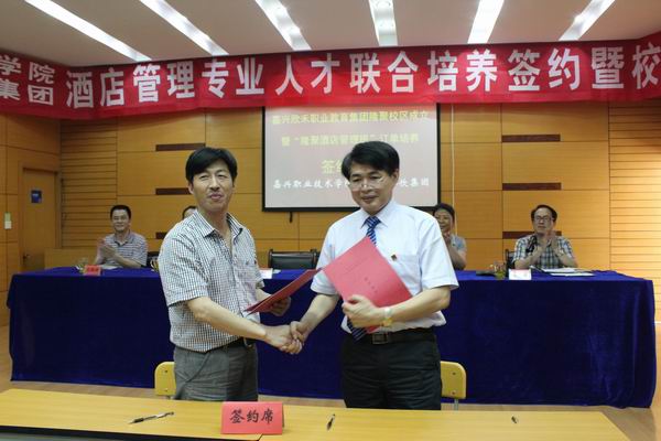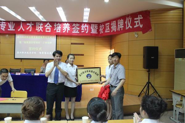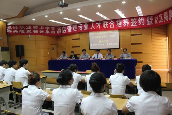 沈建根副院長和盛富林總裁簽署共建嘉興市欣禾職業(yè)教育集團(tuán)聚餐飲集團(tuán)有限公司校區(qū)協(xié)議,并同學(xué)生代表一起簽署酒店管理專業(yè)聯(lián)合培養(yǎng)人才的三方合作協(xié)議,隨后他與盛富林總裁為欣禾職業(yè)教育集團(tuán)隆聚餐飲集團(tuán)有限公司校區(qū)揭牌。