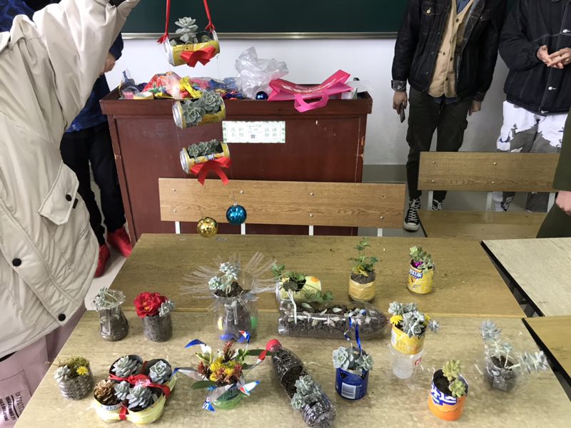 機(jī)電與汽車學(xué)院的團(tuán)學(xué)干部們開展了“廢物利用種綠植”的活動(dòng),利用空塑料瓶、易拉罐制作成了簡(jiǎn)易的花盆容器,變廢為寶,并將多肉植物種進(jìn)盆中送給同學(xué)們。