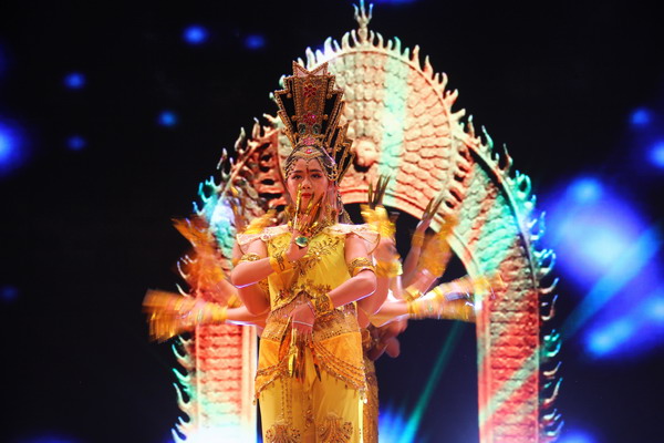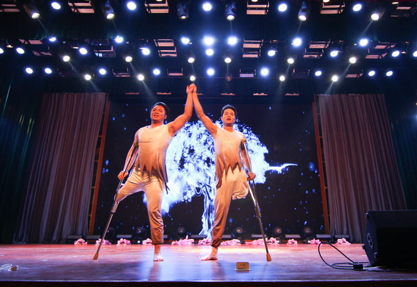 以口執(zhí)筆,失去雙臂的藝術(shù)家在紙上寫下“自強(qiáng)不息”,書(shū)寫流暢,剛勁有力,是十年如一日的堅(jiān)持,是對(duì)命運(yùn)發(fā)出的抗?fàn)?;聾人魔術(shù)師的表演神秘莫測(cè)、震撼全場(chǎng),與現(xiàn)場(chǎng)同學(xué)的精彩互動(dòng)更是將整場(chǎng)晚會(huì)的氣氛推向了一波高潮;接下來(lái)的模仿秀分別模仿了曾志偉、周星馳等知名人士的腔調(diào),又模仿了一首張杰的《最美的太陽(yáng)》,使全場(chǎng)觀眾和聲而歌。表演的最后,由聾啞人舞蹈隊(duì)帶來(lái)被譽(yù)為“生命與藝術(shù)的奇跡”的經(jīng)典節(jié)目《千手觀音》,優(yōu)美曼妙的舞姿、美輪美奐的造型給在場(chǎng)的所有師生帶來(lái)藝術(shù)的享受和心靈的震撼,演出在延綿不絕的掌聲中圓滿落幕。