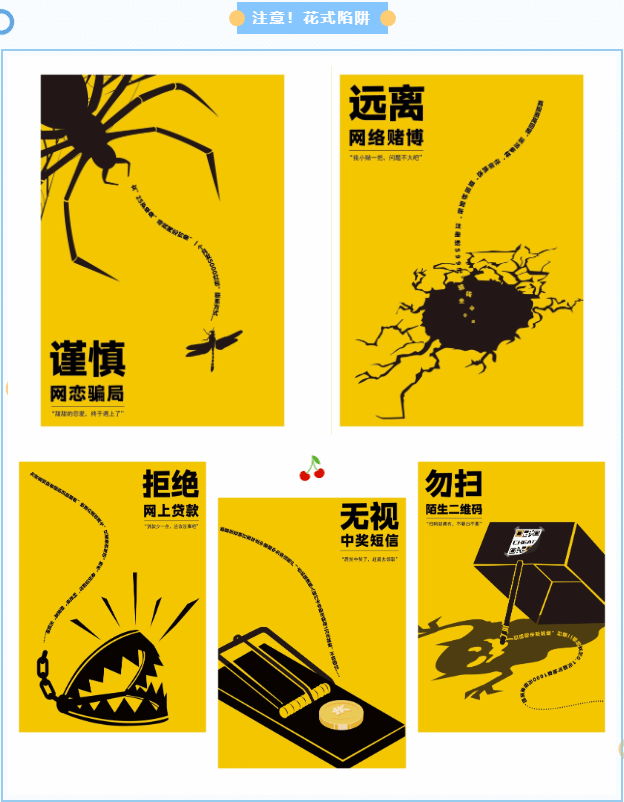 嘉職師生充分發(fā)揮師資、專(zhuān)業(yè)、技術(shù)等方面優(yōu)勢(shì),以獨(dú)特的創(chuàng)意、新穎的表現(xiàn)手法,設(shè)計(jì)了一系列多媒體作品,贏得了專(zhuān)家的一致好評(píng)。時(shí)尚設(shè)計(jì)學(xué)院沈俊暉、尹毅鋒、周卓團(tuán)隊(duì)設(shè)計(jì)的《詐騙邊緣》獲高職海報(bào)組一等獎(jiǎng),時(shí)尚設(shè)計(jì)學(xué)院尹毅鋒、王永杰、吳桐團(tuán)隊(duì)設(shè)計(jì)的《這你都信》和王永杰、尹毅鋒、沈俊暉團(tuán)隊(duì)設(shè)計(jì)的《變臉》分別獲得高職海報(bào)組二等獎(jiǎng);互聯(lián)網(wǎng)學(xué)院、網(wǎng)絡(luò)空間安全學(xué)院丁夢(mèng)媛、程思涵、江斌團(tuán)隊(duì)設(shè)計(jì)的《注意!花式陷阱》獲得高職海報(bào)組三等獎(jiǎng),湯玉婕、朱栩凱、吳銘威、顧詩(shī)琰團(tuán)隊(duì)設(shè)計(jì)的《一生無(wú)詐》高職交互式課件組三等獎(jiǎng)。