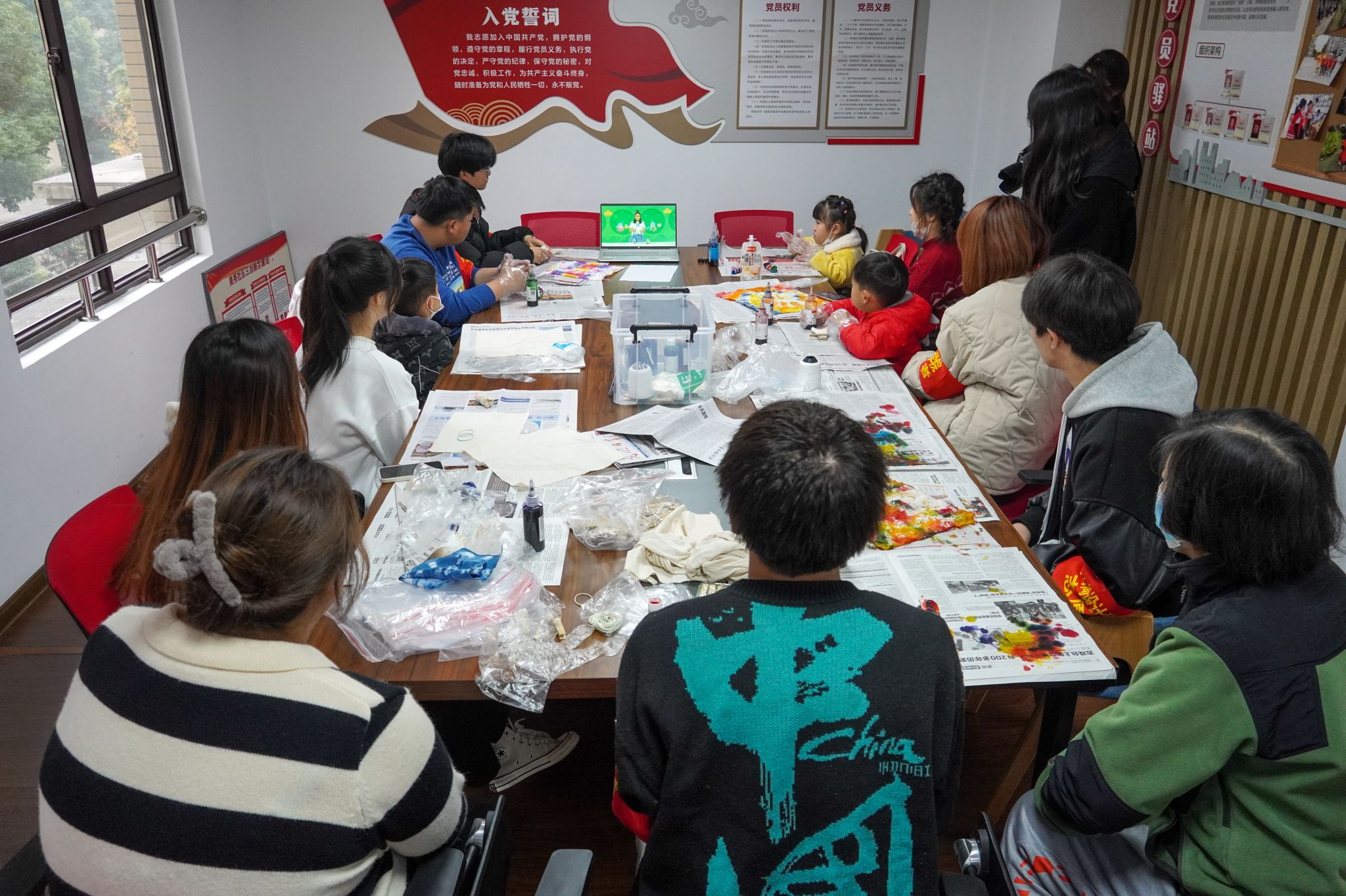 活動當(dāng)天,志愿者與社區(qū)孩子們共同觀看“中國扎染技藝傳承與創(chuàng)新”專題視頻,青禾越川志愿者服務(wù)隊負(fù)責(zé)人詳細(xì)介紹了天然植物染料扎染的基本知識、扎染特點及制作技巧,并指導(dǎo)家長和孩子們發(fā)揮自己的創(chuàng)意,用皮筋、麻繩、木夾等工具,對純白棉手帕進(jìn)行扎結(jié)、染色、固色。