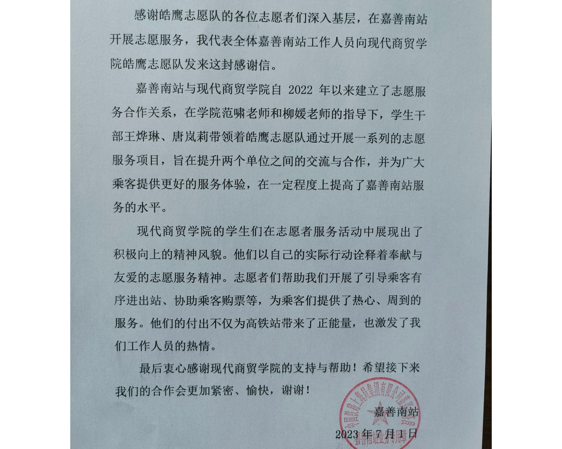 近日,嘉善南站向嘉興職業(yè)技術(shù)學(xué)院發(fā)來(lái)一封感謝信,對(duì)嘉職青年志愿者們給予高度肯定和表?yè)P(yáng),并對(duì)學(xué)校培育出一大批“甘于奉獻(xiàn)、勇于擔(dān)當(dāng)”的青年學(xué)生表示衷心感謝。