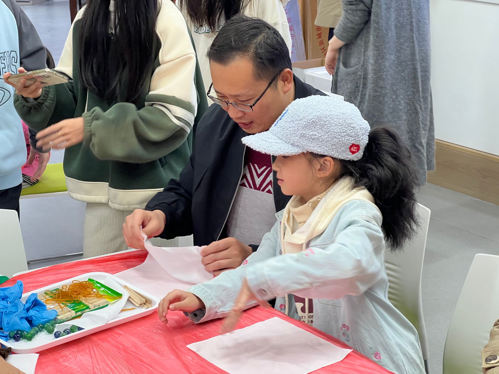 在活動(dòng)現(xiàn)場(chǎng),黨支部成員們細(xì)心地指導(dǎo)小朋友們制作扎染作品。孩子們?cè)诩议L(zhǎng)的陪伴下,親手體驗(yàn)了這一古老的紡織技藝。他們用繩子扎緊布料,再用染料進(jìn)行染色。當(dāng)孩子們看到自己扎染的作品在水中逐漸顯現(xiàn)出獨(dú)特的色彩和圖案時(shí),喜悅之情溢于言表。