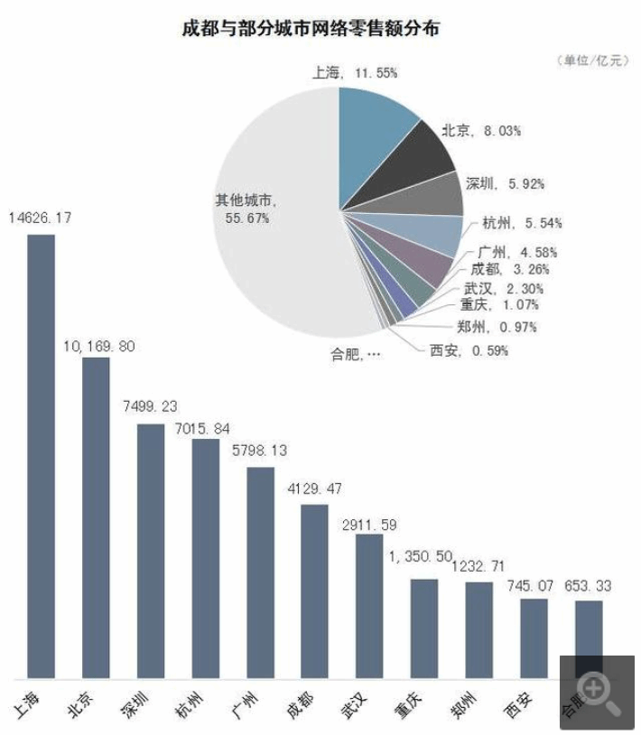 四川省電子商務(wù)大數(shù)據(jù)中心數(shù)據(jù)顯示,2020年1-12月,成都累計實現(xiàn)電子商務(wù)交易額22,637.49億元,同比增長2.79%;網(wǎng)絡(luò)零售額4,129.47億元,同比增長13.39%,在全國主要城市中排名第6位。2020年,“線上+線下”進(jìn)一步融合,全市商貿(mào)經(jīng)濟(jì)快速發(fā)展,下半年網(wǎng)絡(luò)交易額、網(wǎng)絡(luò)零售額同比較上半年分別提升1.36、4.25個百分點。網(wǎng)絡(luò)零售額中,成都實現(xiàn)實物型網(wǎng)絡(luò)零售額2,618.80億元,同比增長22.64%,占比63.42%,為網(wǎng)絡(luò)零售額發(fā)展提供了主要貢獻(xiàn)力。服務(wù)型網(wǎng)絡(luò)零售額1,510.68億元,在疫情影響下全年首次恢復(fù)正增長(+0.27%),消費潛力不斷釋放。