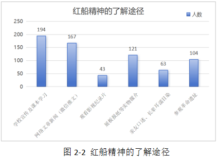 針對紅船精神的了解途徑這個維度分析,通過學(xué)校宣傳及課本學(xué)習(xí)有194人,通過網(wǎng)絡(luò)文章新聞(微信推文)有167人,通過觀看影視紀(jì)錄片有43人,通過展板報紙等實物媒介有121人,通過親友口述、長輩耳濡目染有63人,通過參觀革命遺址有104人,如圖2-2所示。