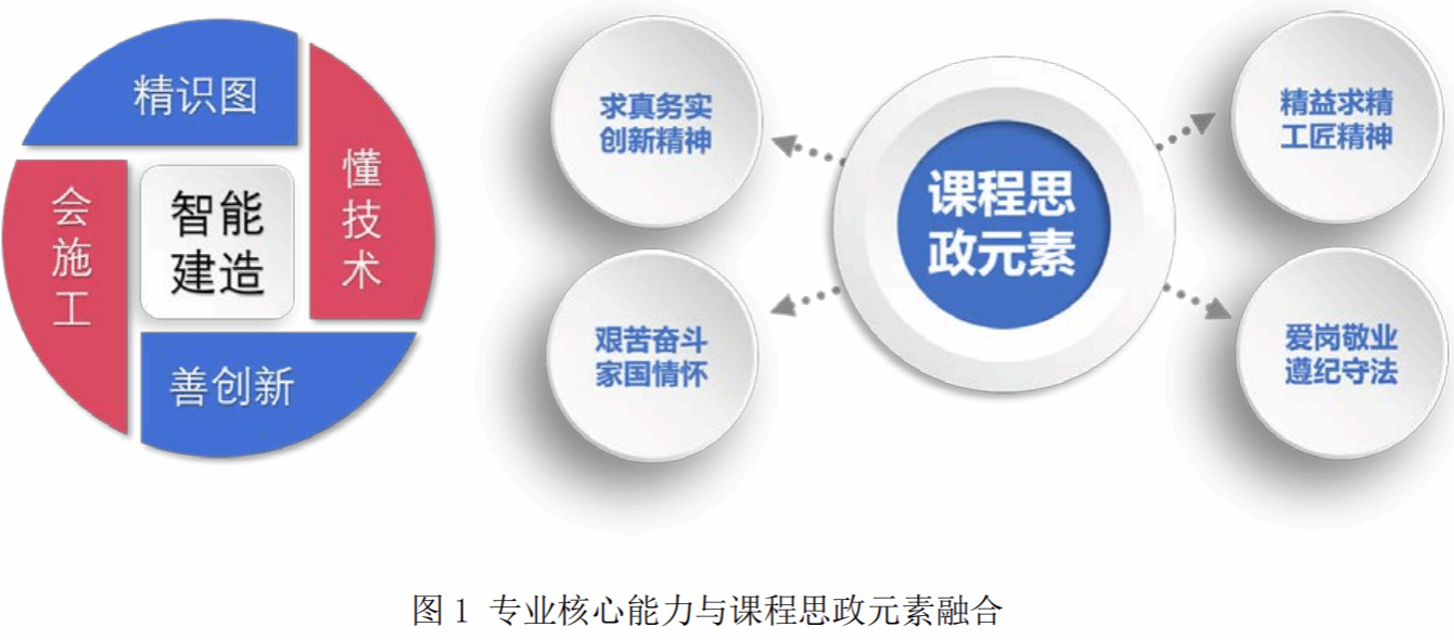 智能建造專業(yè)核心能力與課程思政元素如圖 1 所示。此外,依據(jù)“立德樹人、德育為先”的原則確定了德育目標(biāo),同時(shí)需要第一個(gè)“五位一體”作為政策導(dǎo)向。德育目標(biāo)包括:(政治建設(shè))培養(yǎng)學(xué)生愛國、敬業(yè)、誠信、友善的社會(huì)主義核心價(jià)值觀;(文化建設(shè))培養(yǎng)學(xué)生的民族自豪感與文化自信;(社會(huì)建設(shè))培養(yǎng)學(xué)生求真務(wù)實(shí)、實(shí)踐創(chuàng)新、精益求精的工匠精神;(經(jīng)濟(jì)建設(shè))培養(yǎng)學(xué)生踏實(shí)嚴(yán)謹(jǐn)、耐心專注、艱苦奮斗、追求卓越的優(yōu)秀品質(zhì);(生態(tài)文明建設(shè))培育節(jié)約資源、愛護(hù)環(huán)境、實(shí)現(xiàn)雙碳的環(huán)保意識(shí)。擬通過概括智能建造專業(yè)的特點(diǎn),充分挖掘思政元素;通過專業(yè)知識(shí)與課程思政的有機(jī)結(jié)合和相互滲透,培養(yǎng)學(xué)生的家國情懷、工匠精神、創(chuàng)新精神、愛崗敬業(yè)精神、遵紀(jì)守法意識(shí)、文化傳承意識(shí)以及良好行為習(xí)慣。