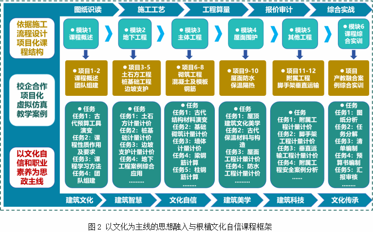 習(xí)近平總書記多次提出:“文化是一個(gè)國家、一個(gè)民族的靈魂?!苯ㄖ鳛槲幕妮d體和符號,承載著中華五千年的文化記憶和歷史文脈。課程建設(shè)在習(xí)近平新時(shí)代中國特色社會主義思想指引下以文化為主線,通過“建筑智慧+傳統(tǒng)文化”根植文化自信。將建筑智慧和優(yōu)秀文化、歷史建筑和人物、大國工程和事跡融入教學(xué),創(chuàng)新構(gòu)建“建筑文化-建筑智慧-文化自信-建筑美學(xué)-建筑科技-文化傳承”的建筑文化育人鏈條,并將精益求精、精準(zhǔn)算量、嚴(yán)格審計(jì)等職業(yè)素養(yǎng)貫穿教學(xué)始終,結(jié)合課程特色以建筑文化為載體將習(xí)近平新時(shí)代中國特色社會主義思想落在實(shí)處。
