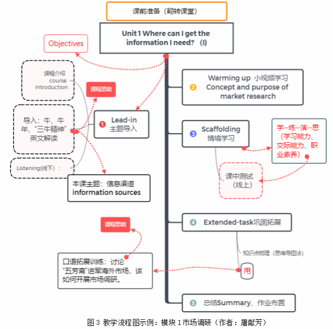 采取三階教學(xué):“三進(jìn)”工作,怎么進(jìn)很關(guān)鍵。本課程教學(xué)通過(guò)學(xué)--練--演,互動(dòng)教學(xué)、合作操練、拓展演繹,訓(xùn)練學(xué)生就某個(gè)主題流暢地進(jìn)行表達(dá)的能力。同時(shí)在教學(xué)過(guò)程中,融入信息時(shí)代的新思想、新觀念和新價(jià)值觀,引導(dǎo)學(xué)生學(xué)會(huì)用英語(yǔ)思考問(wèn)題、用英文向國(guó)外友人講好中國(guó)故事,引導(dǎo)學(xué)生樹(shù)立正確的價(jià)值觀,增加學(xué)生的職業(yè)認(rèn)同感、自豪感,提升學(xué)生思政素養(yǎng)。最后,利用線上教學(xué)平臺(tái)布置自主學(xué)習(xí)和探究?jī)?nèi)容。教師提供開(kāi)放式討論話題,鼓勵(lì)學(xué)生通過(guò)各種渠道自主學(xué)習(xí)和探究,提高學(xué)生的學(xué)習(xí)能力、思辨能力和適應(yīng)能力。例如:以“市場(chǎng)調(diào)研”模塊的教學(xué)為例(圖3),首先以外交部發(fā)言人華春瑩對(duì)“三牛精神”(Three Ox Spirit)的英文解讀導(dǎo)入,學(xué)生搜集不同文化下牛的表達(dá)與內(nèi)涵,在不同文化的交流和碰撞中塑造文化自信以及正確的人生觀、價(jià)值觀,同時(shí)引出主題---信息渠道以及如何作市場(chǎng)調(diào)研。通過(guò)情境學(xué)習(xí),開(kāi)展市場(chǎng)調(diào)研相關(guān)互動(dòng)討論。繼而在小組操練中,提升團(tuán)隊(duì)合作意識(shí)及語(yǔ)言技能。然后圍繞中國(guó)制造或本土品牌(比如“五芳齋”公司海外市場(chǎng)拓展)開(kāi)展口語(yǔ)拓展練習(xí)并演繹,激發(fā)語(yǔ)言學(xué)習(xí)的熱情,同時(shí)增強(qiáng)愛(ài)國(guó)意識(shí)和文化自信。