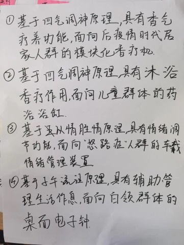 設(shè)計(jì)定義的來(lái)源也并非主要依賴用戶研究,而更取決于“治未病”專題的學(xué)習(xí),首先從文化認(rèn)知層面的突破,映射到現(xiàn)實(shí)生活中,提出設(shè)計(jì)機(jī)會(huì),再結(jié)合一些敏捷研究和想象力,快速發(fā)展設(shè)計(jì)定義。操作上,在設(shè)計(jì)研究階段,我們課程團(tuán)隊(duì)也安排了設(shè)計(jì)構(gòu)思頭腦風(fēng)暴環(huán)節(jié),以快速草圖的形式,激發(fā)下想象力。把設(shè)計(jì)研究、分析和設(shè)計(jì)構(gòu)思穿插起來(lái),提高工作效率和進(jìn)度。另外,課程的一個(gè)重要考慮是讓每組的設(shè)計(jì)定義要關(guān)聯(lián)已有的一個(gè)電器類產(chǎn)品和品牌。這個(gè)設(shè)定,雖然會(huì)限制學(xué)生的想象力和作品的創(chuàng)新性,但更符合課程的教學(xué)要求和學(xué)生的成長(zhǎng)進(jìn)階,降低難度和風(fēng)險(xiǎn),有利于他們把握設(shè)計(jì)的過(guò)程和結(jié)果。下面是部分小組工作的輸出展示。(見(jiàn)圖7)